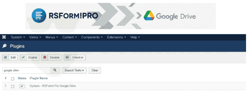 In the backend area go to the Extensions > Manager > Install page, and install the plugin. Next thing is to publish the plugin from Extensions > Plugins, search for the "System - RSForm! Pro Google Drive" plugin.