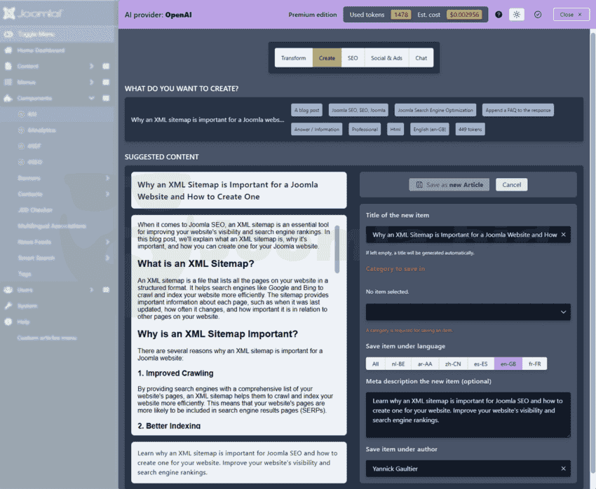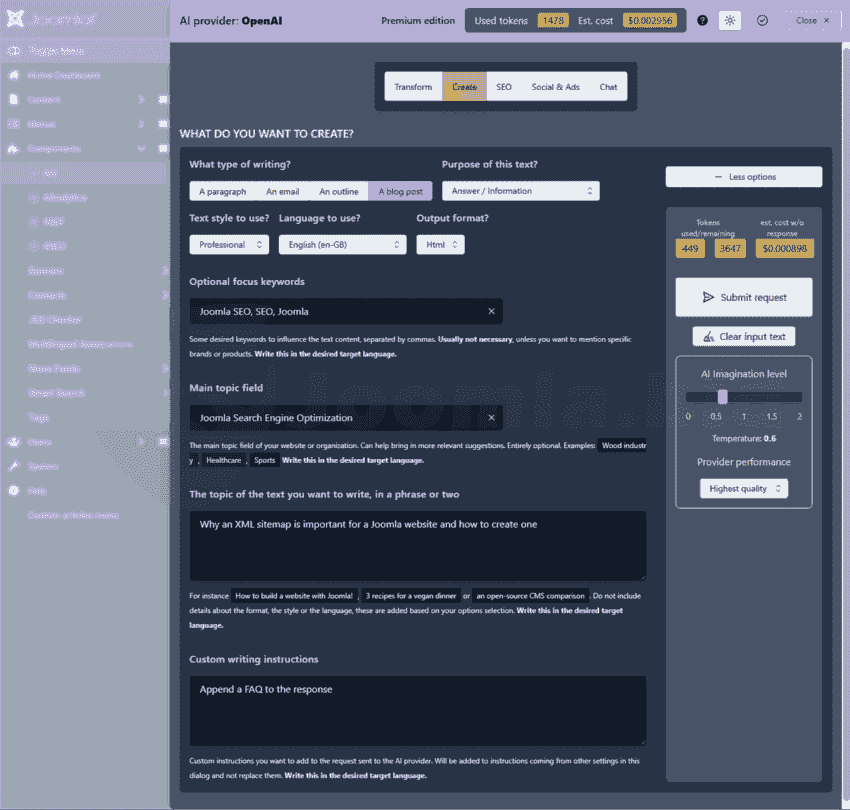 4AI is a state-of-the art Joomla extension that gives you an always-on AI-powered assistant to create and revise the content of your website.