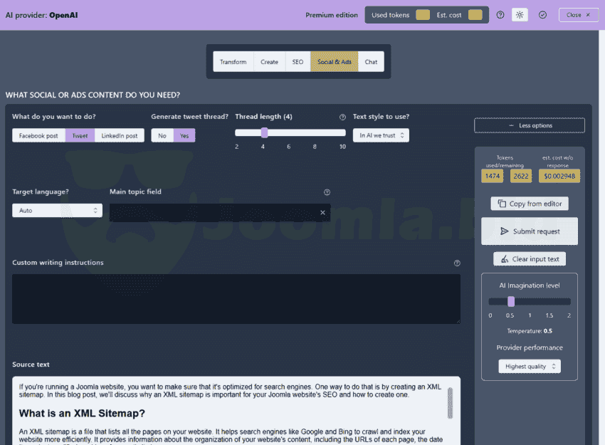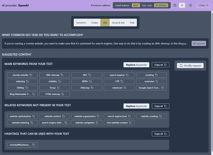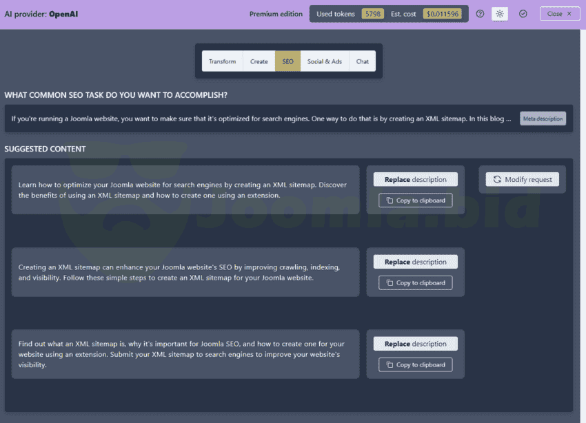 It's integrated into Joomla so that you can create a new article or product description, a translation, spell/check, title, description, tweet, Facebook posts in seconds, or just chat freely without opening a new tab.