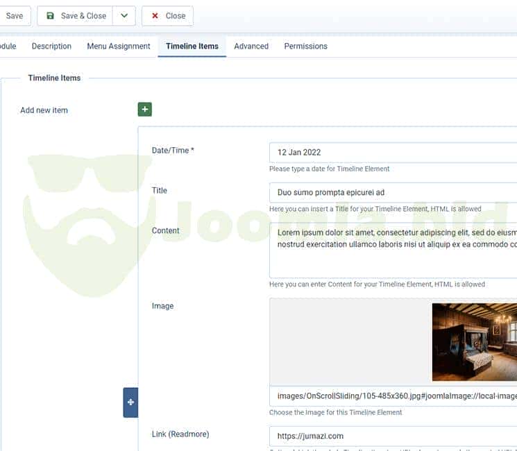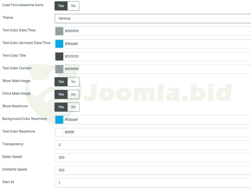 Allows you to display your contents with jquery effect, you can choose click title of timeline element and you can see the content will be shown up rhythmically on the module.