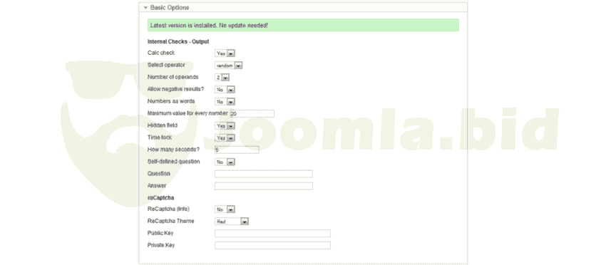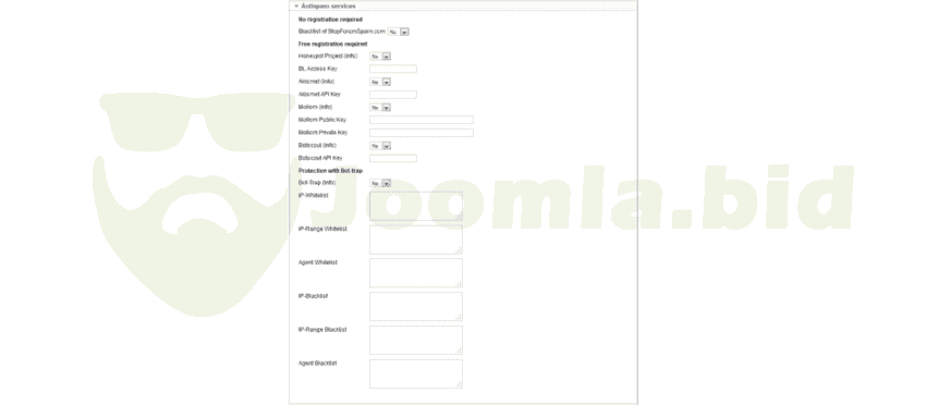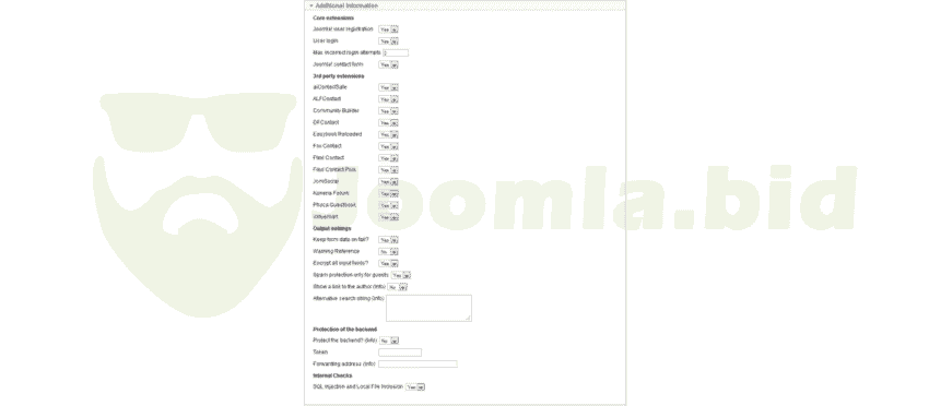 Protects Joomla! core forms and 3rd party extensions by integrating spam protection services and adds an arithmetical problem, a hidden field and a time lock