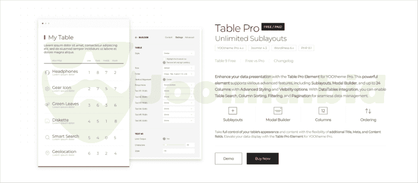 Enhance your data presentation with the Table Pro Element for YOOtheme Pro. This powerful element supports various advanced features, including Sublayouts, Modal Builder, and up to 24 Columns with Advanced Styling and Visibility options. With DataTables integration, you can enable Table Search, Column Sorting, Filtering, and Pagination for seamless data management.