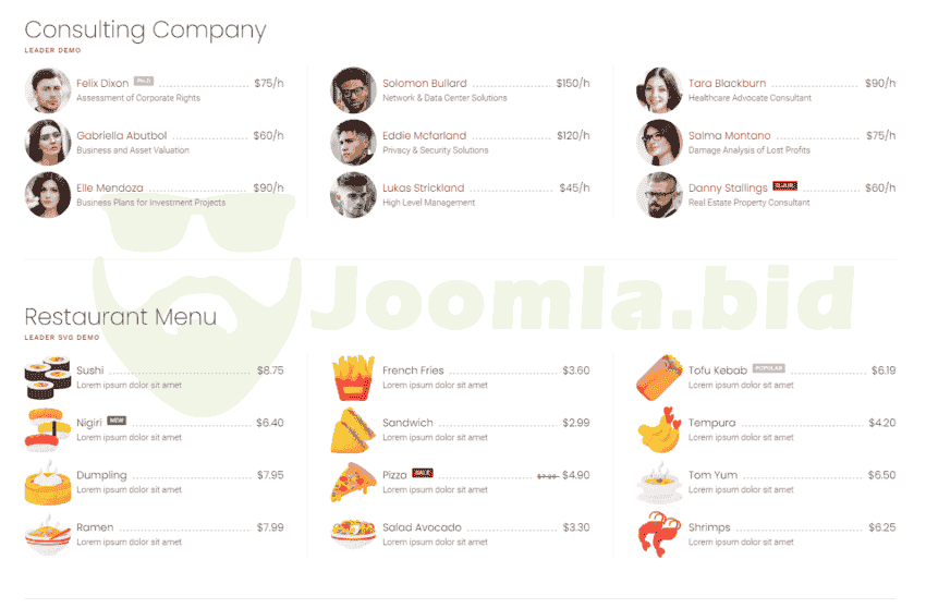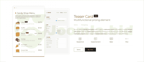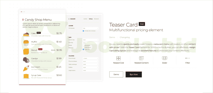 Do you need to quickly and easily create teasers, a restaurant menu with leaders, or other content with prices? With the Teaser Card Element for YOOtheme Pro Builder, you can effortlessly design captivating layouts and leverage its excellent features to showcase your content effectively.