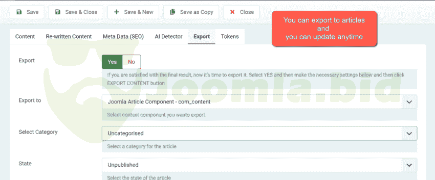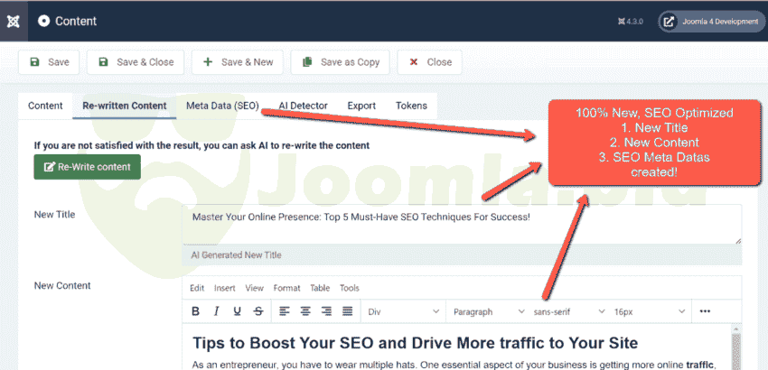 Ignite the Power of AI: Let AI Read, Interpret, and Re-Write! Joomla AI Content ReWriter is a powerful extension that can help you to create engaging and informative content for your Joomla website. It uses artificial intelligence to interpret your submitted content and rewrite it in a new way, preserving the meaning and style of the original content. The extension also includes a number of features that can help you to improve the SEO of your content, such as generating meta description, keywords and titles.