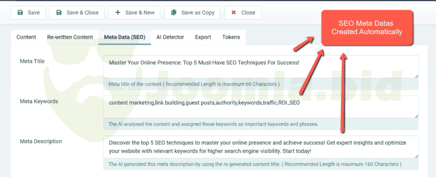 Joomla AI Content ReWriter will find the important keywords, bold them, will write a meta description and an alternative meta title, a heading and a well-structure! This will definitely boost the SEO of the content and your site!