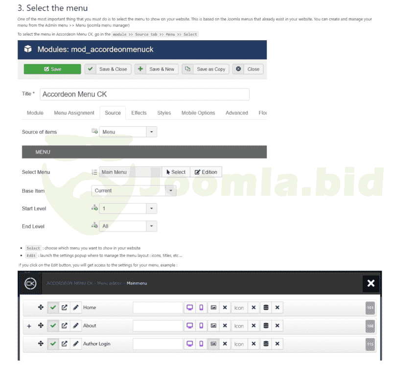 The menu Accordeon CK is an advanced accordion menu system that allows you to insert some descriptions for each menu link, to load any module in the menu structure, and display some image beside the text or just without any text. Menu manager Edit your menu items directly into the interface from the module to set the title, description of each menu item, and to load a module into a submenu