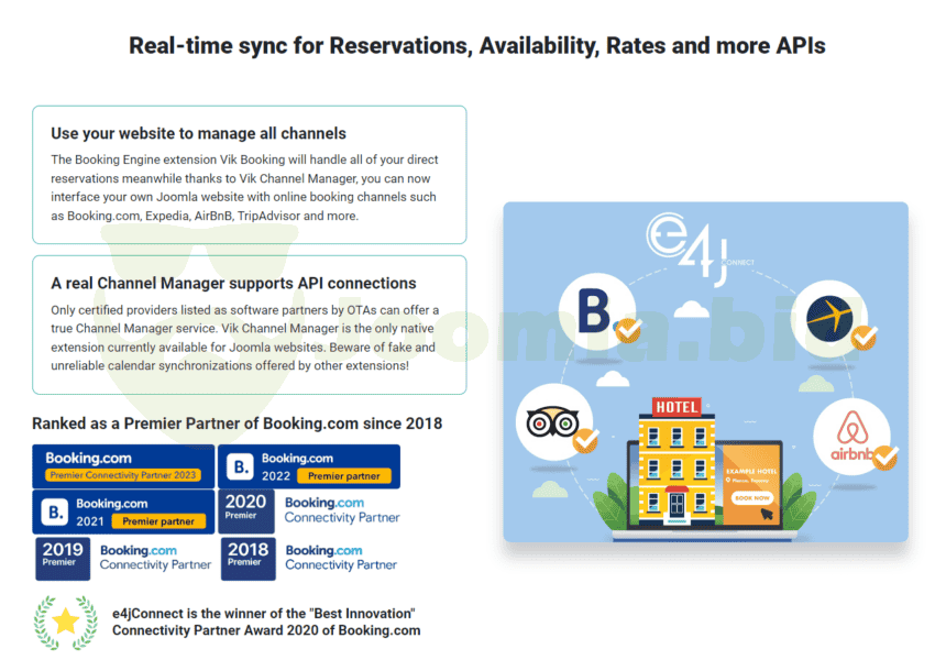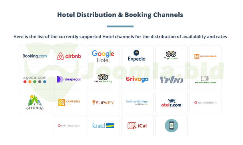 The Booking Engine extension Vik Booking will handle all of your direct reservations meanwhile thanks to Vik Channel Manager, you can now interface your own Joomla website with online booking channels such as Booking.com, Expedia, AirBnB, TripAdvisor and more.