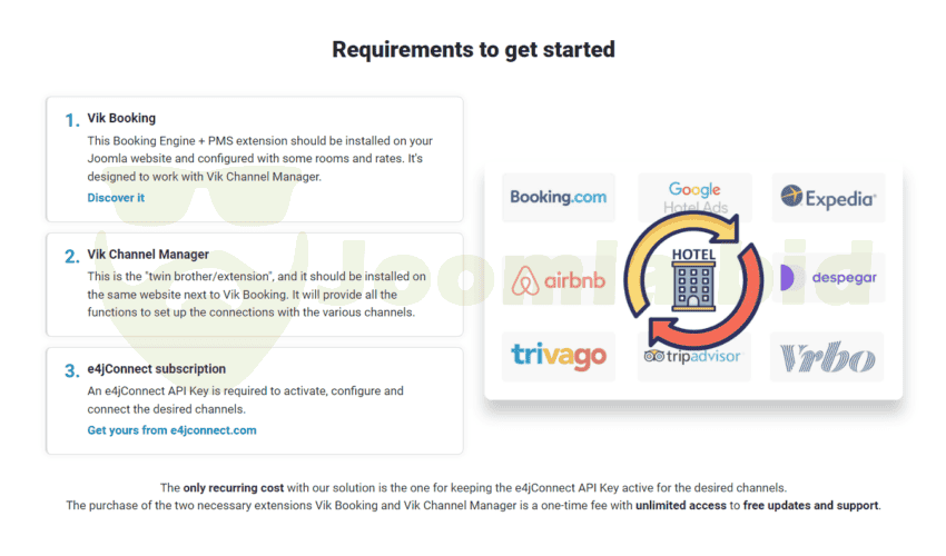 The extension requires Vik Booking to be installed on the same Joomla! website and an active e4jConnect API Key that will let you configure all the channels you requested.