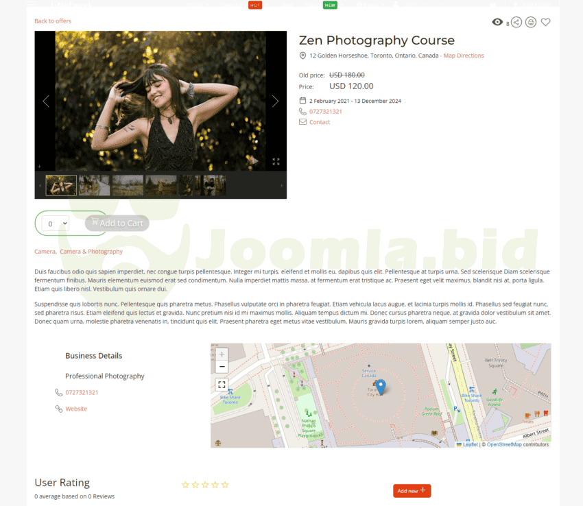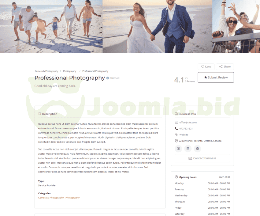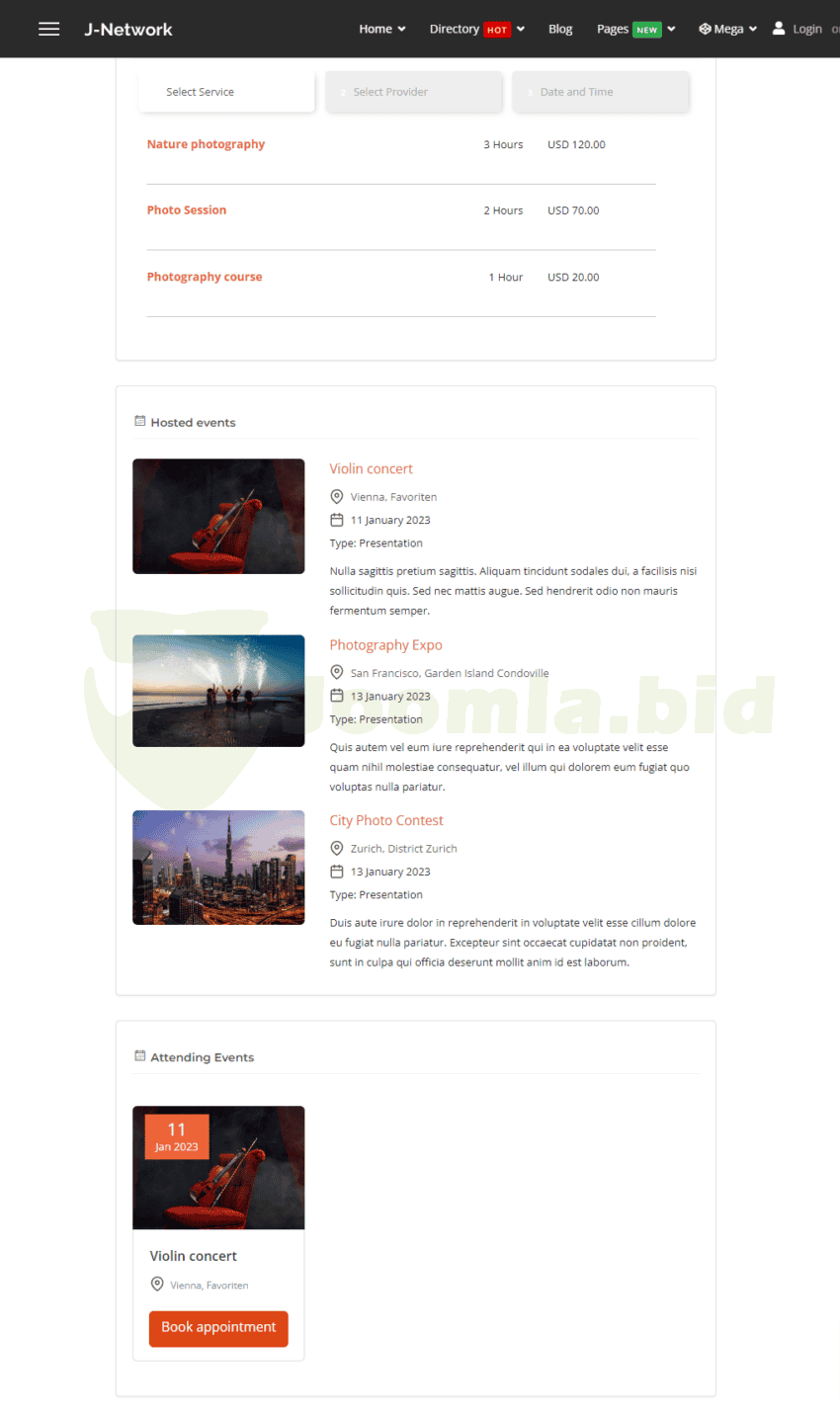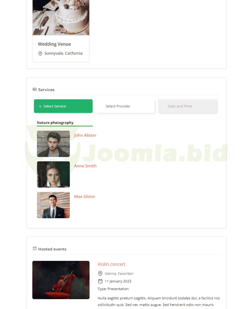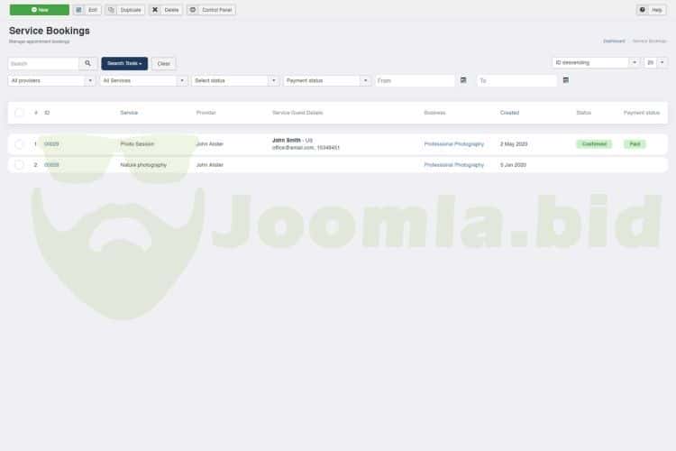 How does it work? For each business, you can define the offered services based on an availability schedule. The services can be booked by the end users based on the current availability, and for each booking, the business owner and the site admin will be notified with the booking details.