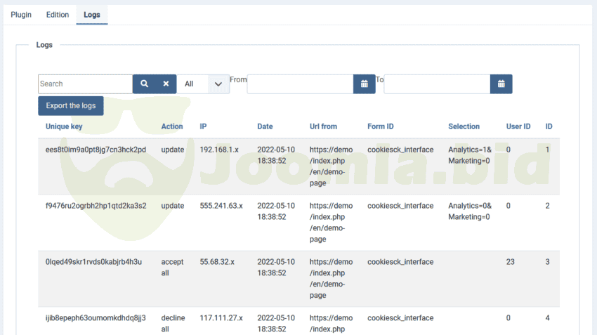 You can log the consents of the visitors in a list where you can search for any data (date, url, options selected...) and export them as CSV file