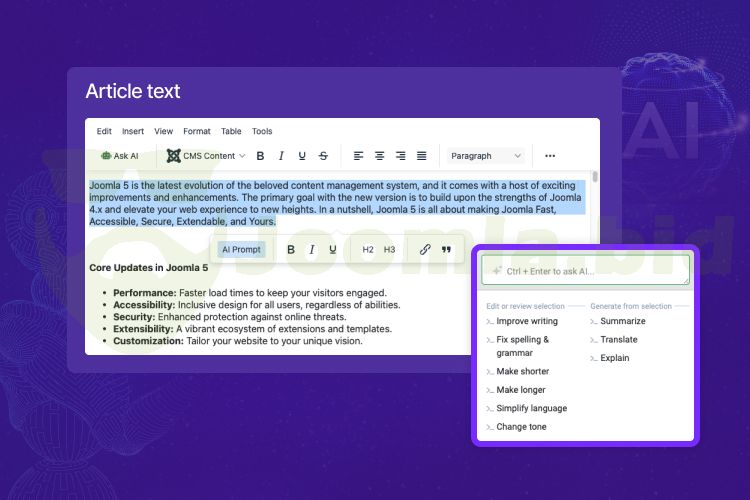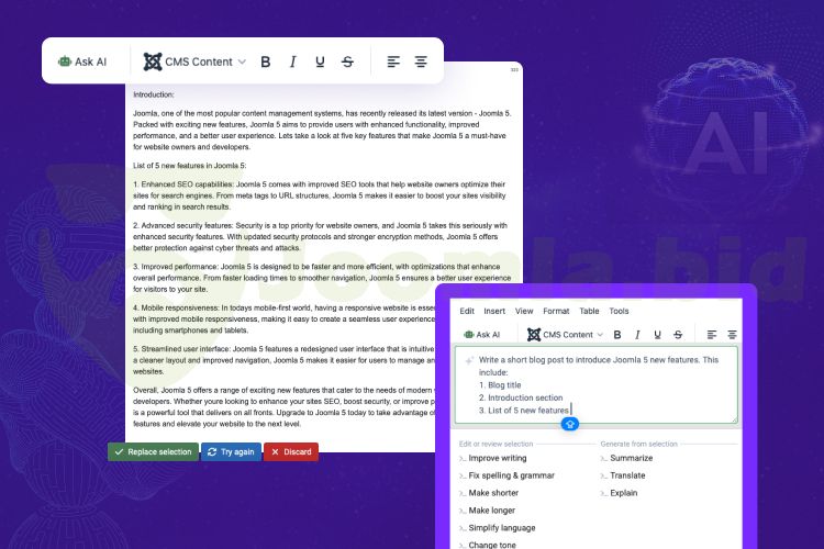 Welcome to JA AI Assistant – the AI-Powered Joomla extension designed to revolutionize your content creation process based on OpenAI. Integrated seamlessly into the Joomla editor, this extension leverages advanced AI capabilities to help you generate, refine, and optimize your content effortlessly. Perfect for content creators of all levels, JA AI Assistant ensures your content is polished, engaging, and optimized for success.
