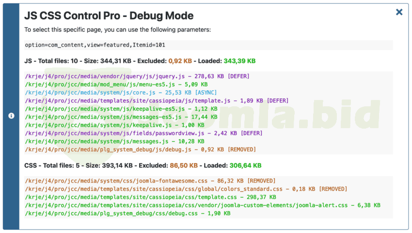 JS CSS Control controls the loading of JS and CSS files globally and specifically in Joomla! With this plugin, the loading of JS and CSS files can be easily controlled. You may suppress loading those files on pages where they are not needed. This might be important for example at the frontpage for optimizing loading times. The plugin is able to exclude those files globally or just on selected pages.