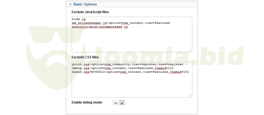 Enter only one file name each line. If you want to disable the file globally on all sides, then it is sufficient to enter the name of the file with the .js / .css extension. If you want to exclude specific files on a particular page, then you must also specify the parameters of the page. The parameters can be determined using the option "Debug Mode".