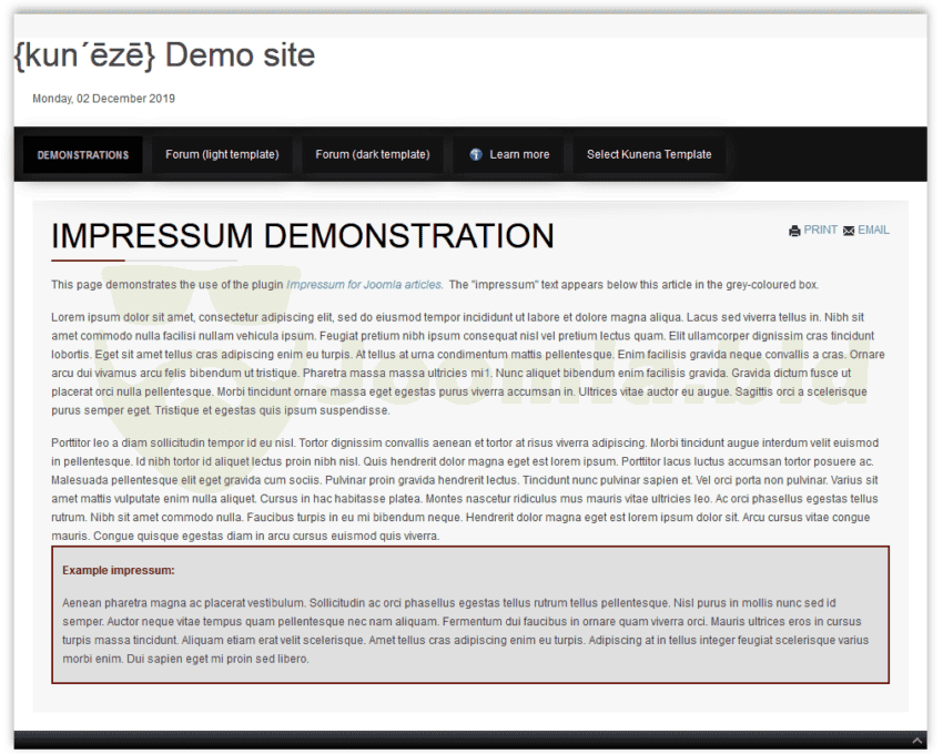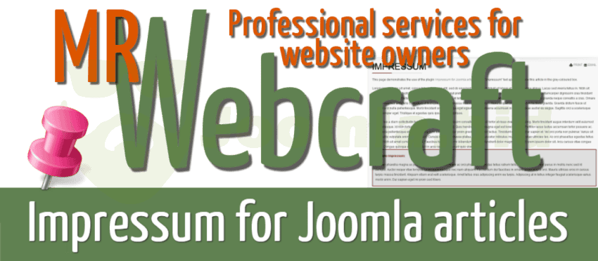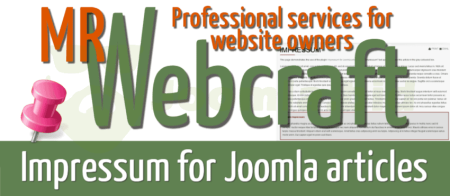 Impressum for Joomla articles provides a convenient way to add additional notes—text, images, etc.—that will be displayed on all articles within a specified category or categories with the added ability to exclude certain articles from selection or base the selection only on certain articles. The plugin can be tailored to a broad range of uses, for example, to display legal notices, disclaimers or other advice pertaining to those articles.