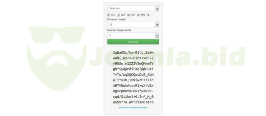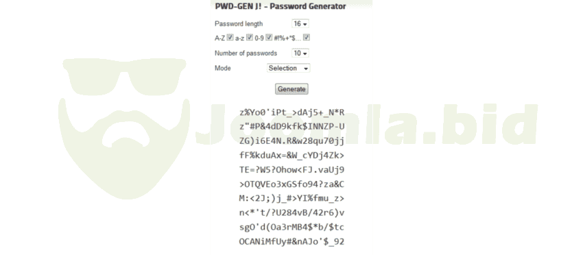 Password Generator J! is a small, fast generator for passwords (with Easy and Safe Mode). This module is designed to quickly generate passwords with various combinations of upper and lower case letters, numbers, and special characters. The length of the password can be set up to 20 characters, and up to 30 passwords can be generated per generation process.