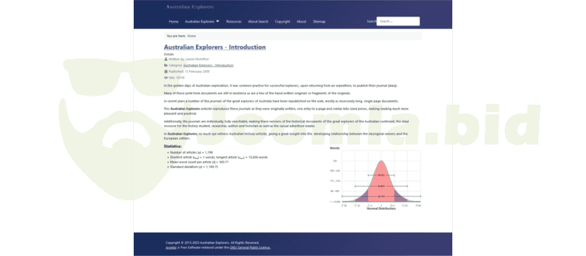 This module displays a list of articles on a Joomla website, who wrote them and (optionally) a link to the each article and the word count for each article. A “word” is defined as a string of text with a space (or multiple spaces, including non-breaking spaces) following it. You can choose to analyse the word count for published and archived articles or include trashed and unpublished articles in the analysis. The module lists the articles in descending order (i.e. the longest articles to the shortest) together with the word count (x) for each article and a statistical analysis of the number of articles (|x|), the shortest article (xmin), the longest article (xmax), mean word count per article (x̄) and standard deviation (σ) also plotted on a normal distribution chart at the end.
