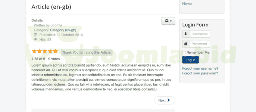 This plugin is an extended version of the Vote plugin from the core package. You can display the rating stars before or after the content. It's possible to limit the loading execution only to the article view. The votes are transferred via Ajax requests to the server which increases the user experience greatly (the page does not have to be reloaded completely). You can add an intro text using a Joomla! language string and display statistics (overall rating and amount of votes) below the rating stars.