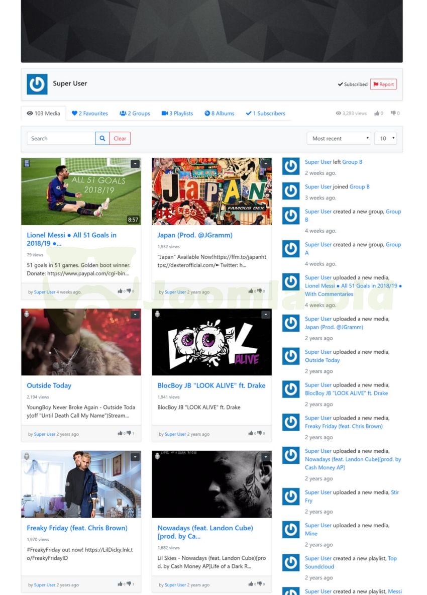 JoomMedia let you build a powerful media sharing platform inside your Joomla website easily, you can do everything you need to display and manage your media items like videos, photos, audios and documents all within your website in an organized and manageable layouts.