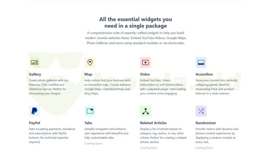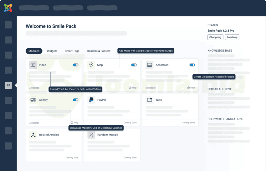 Smile Pack is an all-in-one extension that offers a rich collection of customizable modules, including Galleries, Maps, Videos, Accordions, Tabs, PayPal Buttons, Related Articles, Testimonials, Pricing Tables, and more. Each module can be used as a standard module or using shortcodes, giving you ultimate flexibility in your website design.