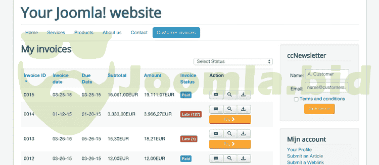 Customers can log into the Joomla! website to view and download invoices online. Invoices can be easily assigned to single or multiple users, which can then view and download the bills online on your website.