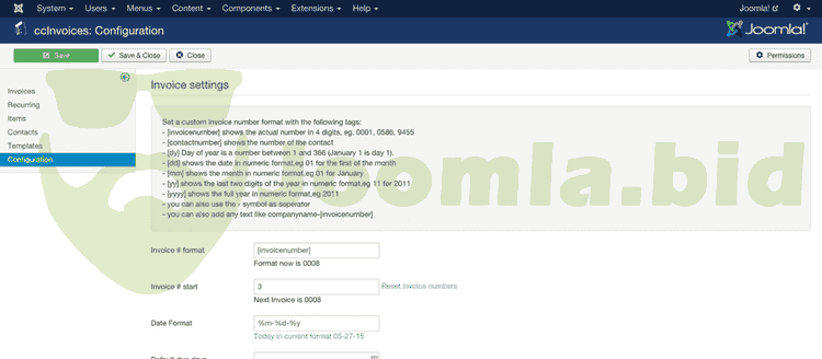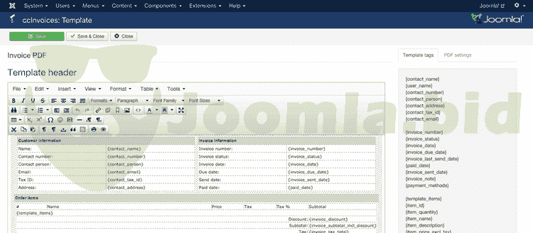 Invoice and other templates can be easily customized. You can use the WYSIWYG editor you are familiar with from the Joomla! Article Manager, or get even more control and directly edit the HTML