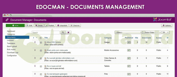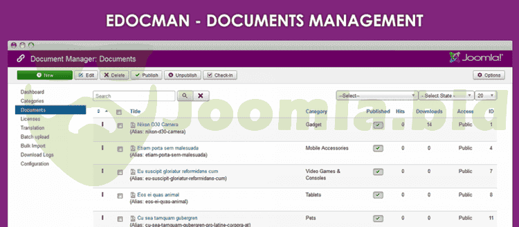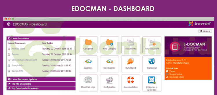 EDocman is the leading document and files download manager extension for Joomla. Building based on Joomla Access Control Level System (ACL), Edocman gives you a very powerful, flexible permission system which you can use to control who can access, download, manage your documents from both front-end and back-end of Joomla site. Especially, Documents Indexing tool can be used to scan PDF, MS Office files as soon as they are uploaded.