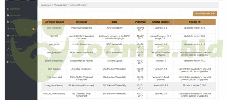Securitycheck Pro incorporates a database where you can see all the vulnerabilities known to our version of Joomla. This database is constantly updated to include the latest vulnerabilies. -