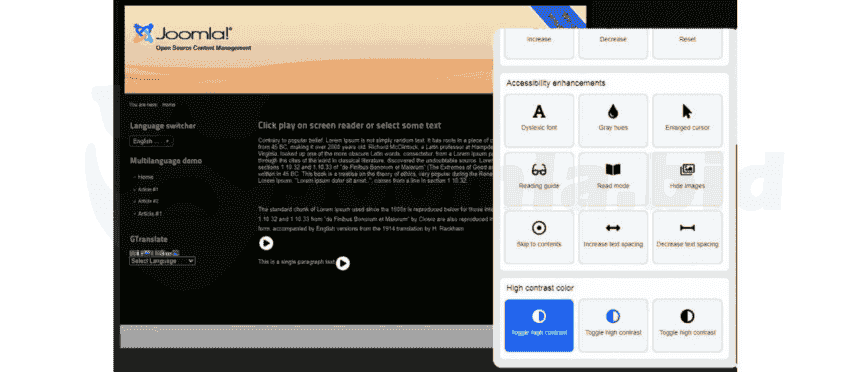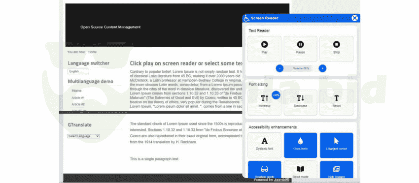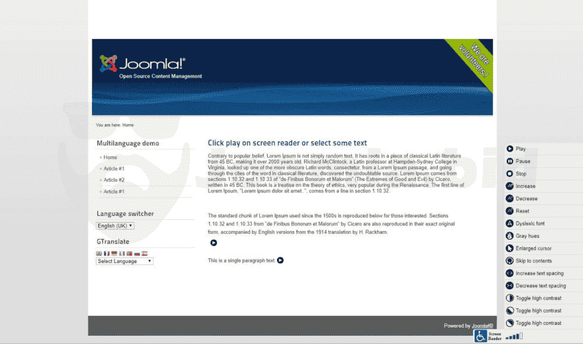 Screen Reader with FontSize and HighContrast for Joomla! is an advanced and lightweight plugin that will add a lot of accessibility features for reading and improve the contents quality to all visually impaired users.