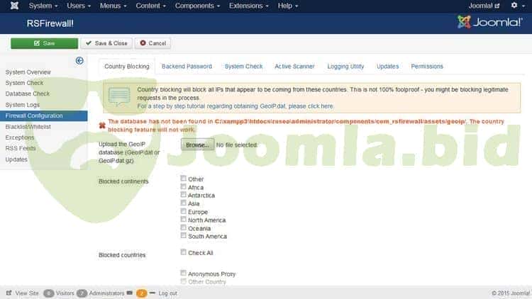 » Country blocking - Allows you to select which countries have access to your Joomla! website (also blocks anonymous proxies). Based on GeoIP Lite Country database.