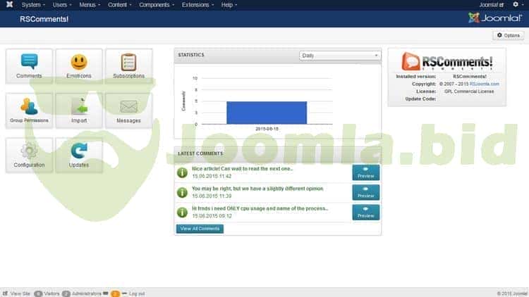 RSComments! completes your Joomla! based site. Unlike other Content Management Systems, Joomla! does not have an integrated commenting component. This is where RSComments! comes into place. Easy to configure, flexible and versatile, this will allow you to enable comments on your site within minutes after installation.