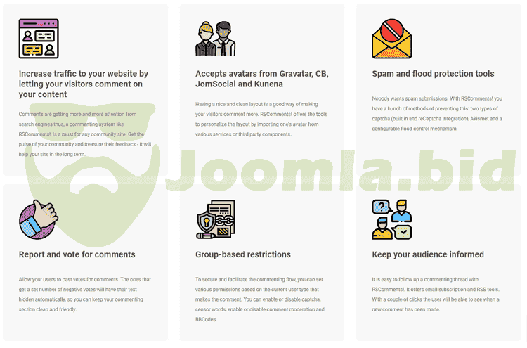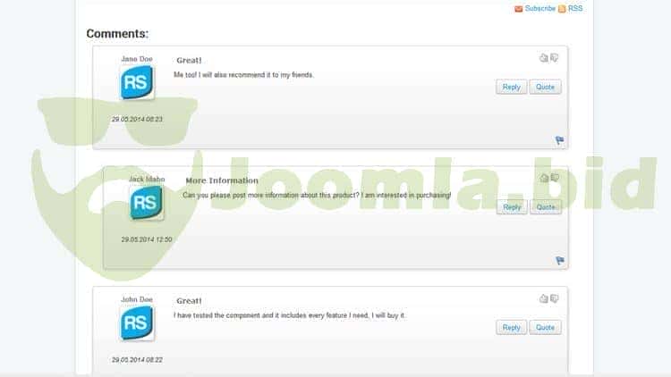 User-friendly, customizable and packed with features like emoticons, BBCode, user permissions and importing from other commenting components among many others, RSComments! makes up for a complete solution for your website's commenting sections (articles, content, blogs, product pages).