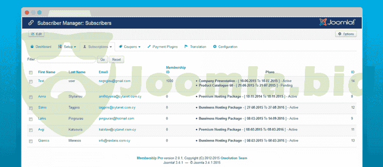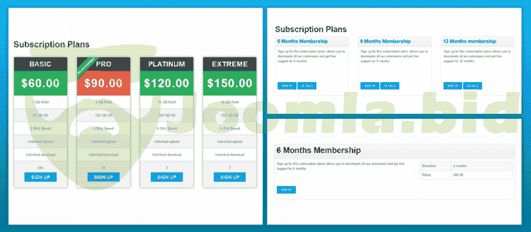 - Different ways to display subscription plans to end users: Via menu item, embed the plans into a Joomla article using Membership Plans content plugin or display plans in a module position using Membership Plans module.