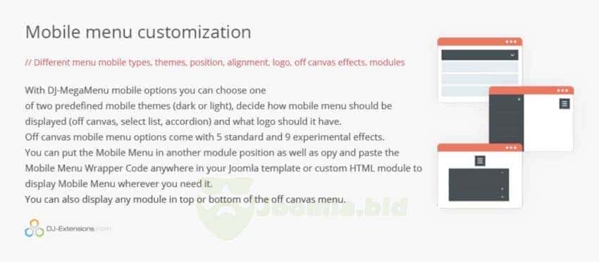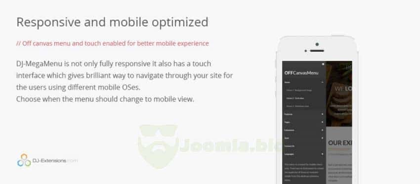 Fully responsive, mobile-optimized with horizontal and vertical layouts and an off-canvas menu. You can set the number of columns per menu and even put any modules inside. DJ-MegaMenu gives you a wide range of possibilities to set up the menus you need. Designed with mobile in mind, so you'll find many handy features.