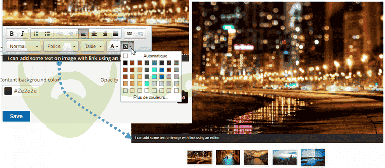 - 1 advanced slideshow theme with custom text area, WYSIWYG editor, link on text, transparent text background, thumbnail navigation