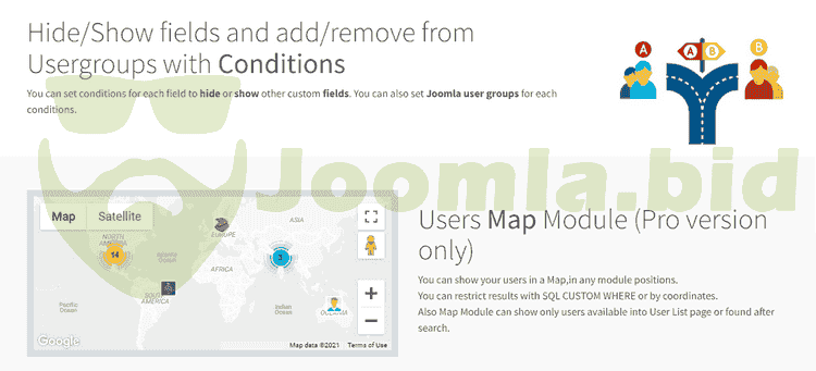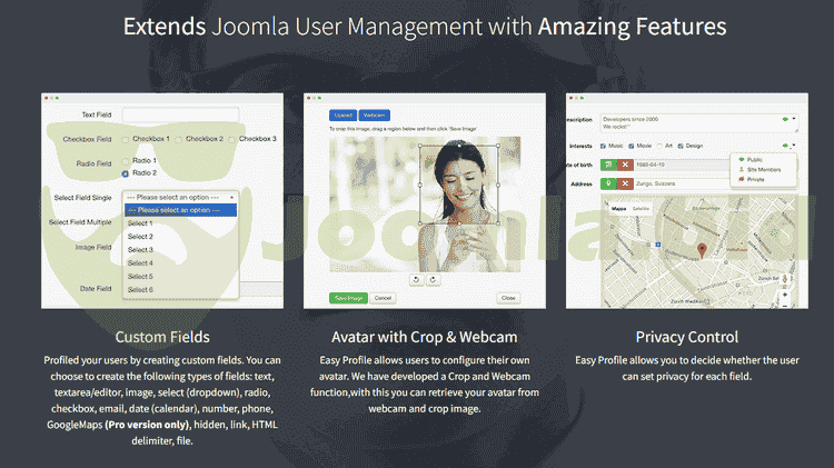 Extends Joomla User Management with Amazing Features. Custom Fields Profiled your users by creating custom fields. You can choose to create the following types of fields: text, textarea/editor, image, select (dropdown), radio, checkbox, email, date (calendar), number, phone, GoogleMaps (Pro version only), hidden, link, HTML delimiter, file.