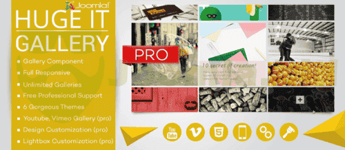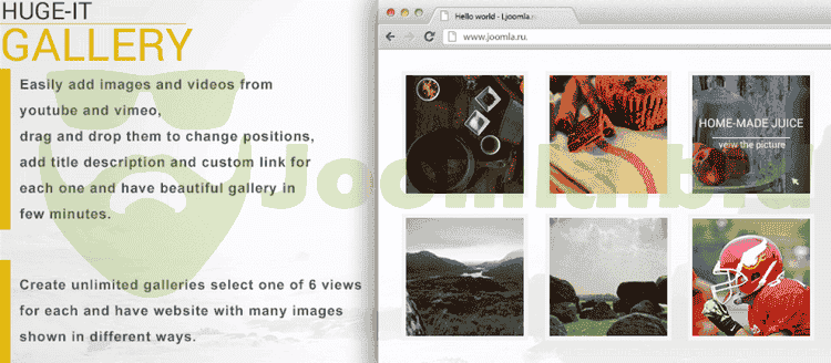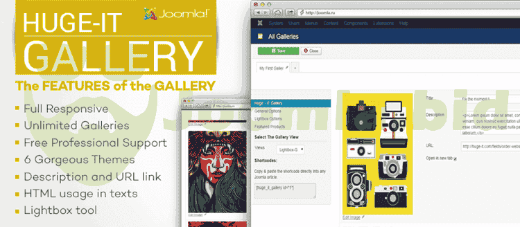 Huge-IT Image Gallery Huge-IT Image Gallery extension is perfect choice for Joomla users. No matter use on computers or mobile phones and tablets. It provides a powerful mechanism for downloading and managing a gallery of images, with the ability of multiply uploading, adding removing ordering organizing images, editing thumbnails The plugin allows you to add multiple images to the gallery, create countless galleries, add a description to each of them, as well as make the same things with video links. You can change the order of your project by easy drag & drop function
