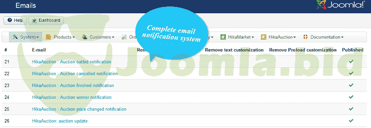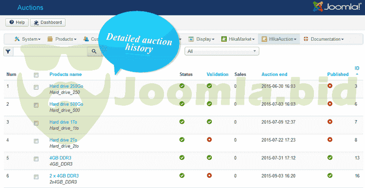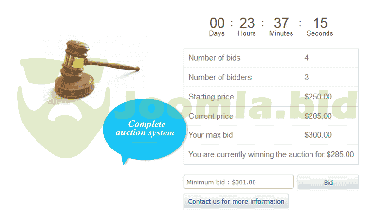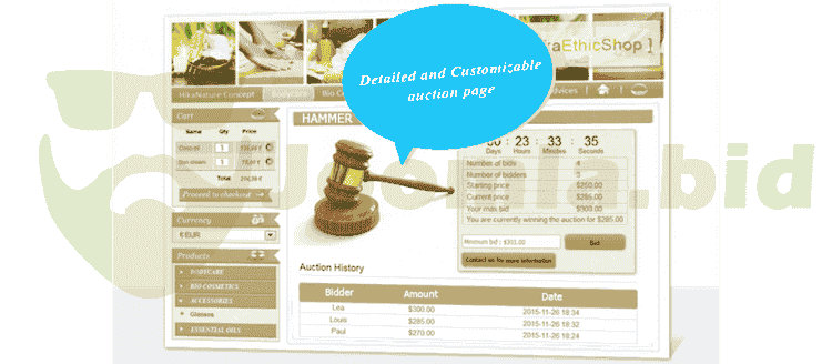 HikaAuction is a Joomla! Bidding component for the e-commerce solution HikaShop. It's quick to set up and will enable you to easily create, manage, and follow auctions on your shop. Your customers will bid for the product they want and the customer with the highest bid will win the auction.