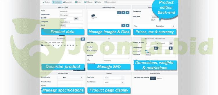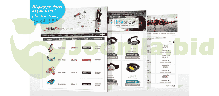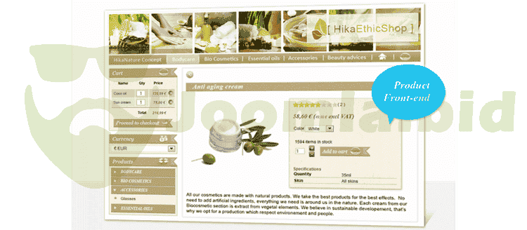 - Joomla content tags in order to add "add to cart" buttons, product prices, etc anywhere on your website
