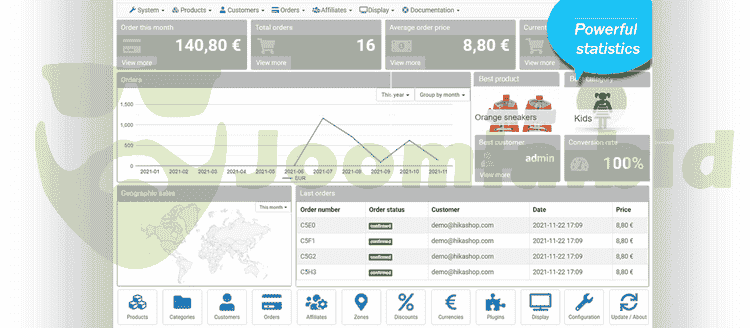 HikaShop is a native E-Commerce extension for all versions of Joomla. It is built for simplicity and flexibility. HikaShop also has a wide range of marketing tools, but also powerful statistics displayable on your HikaShop dashboard to help you manage your store.