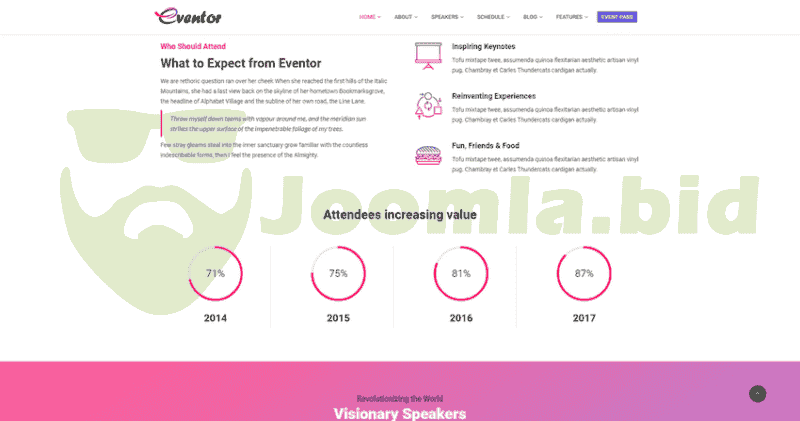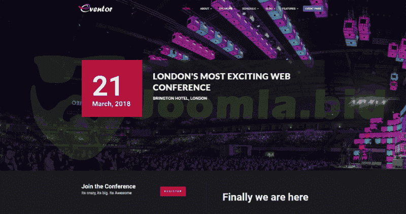 Eventor is a professional Joomla template for organising meeting, seminar, conference, venue or any other kind of event. The template has Drag & Drop SP Page Builder ($49) and Powerful Theme Options. Eventor is a solid Event & Conference Template for better experience.