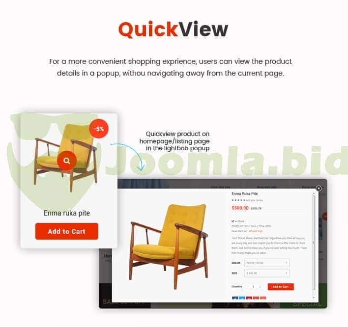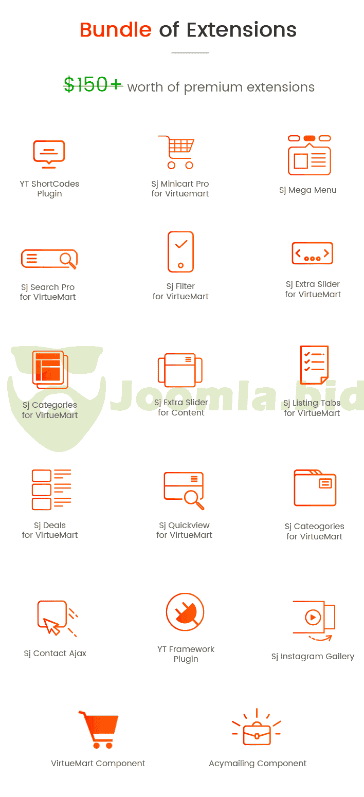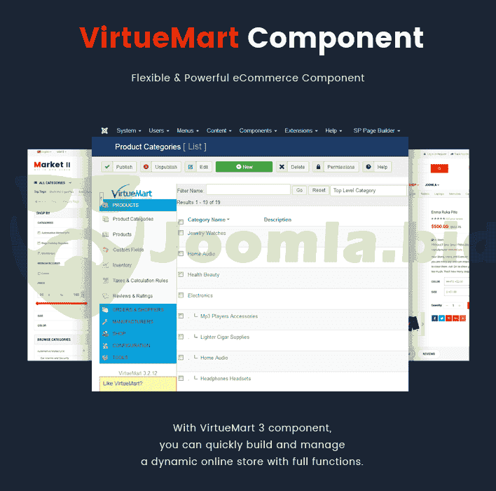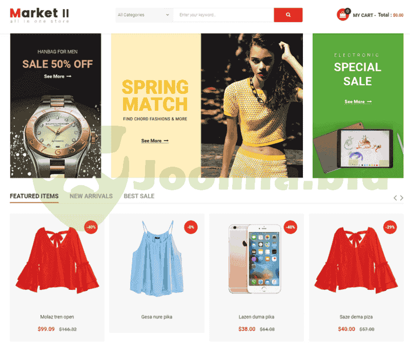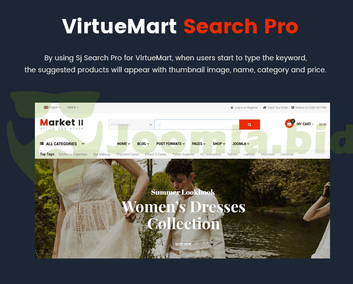Furthermore, the VirtueMart template - Sj Market II is powered with VirtueMart 3 component along with lots of advanced eCommerce features and functions such as: Mega Menu, Drag & Drop Builder, Ajax Filter for VirtueMart, Mini Cart Pro for VirtueMart, VirtueMart Product Quickview, RTL language, 65+ Useful ShortCodes built-in..... You can build an eCommerce website just in few minutes without much coding knowledge.