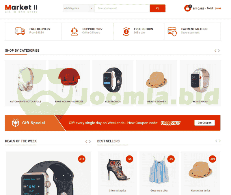 Sj Market II is a powerful, professional multipurpose eCommerce Joomla Responsive Template that perfect for various kinds of online stores, eCommerce & business websites. With Sj Market II, you can quickly setup your online store just in minutes.