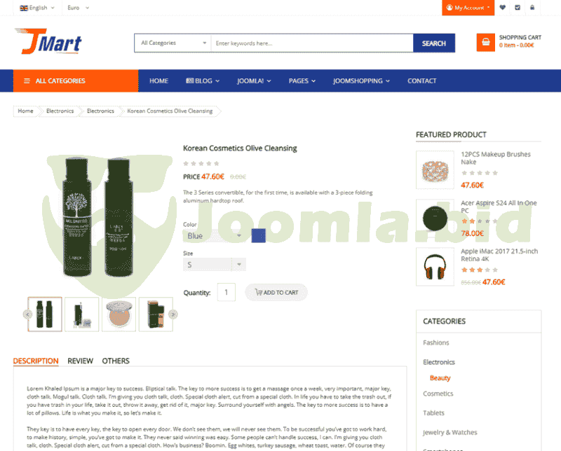 The JoomShopping Joomla template - Sj JMart can hold an online store with a huge number of products. You can easily manage the store and make it impressing among others. Sj JMart is best matched for fashion, technologies, accessories, cosmetics, jewelry, shoes and many more. Besides, we also provide the quickstart package that you can quickly install your website as same as our demo.
