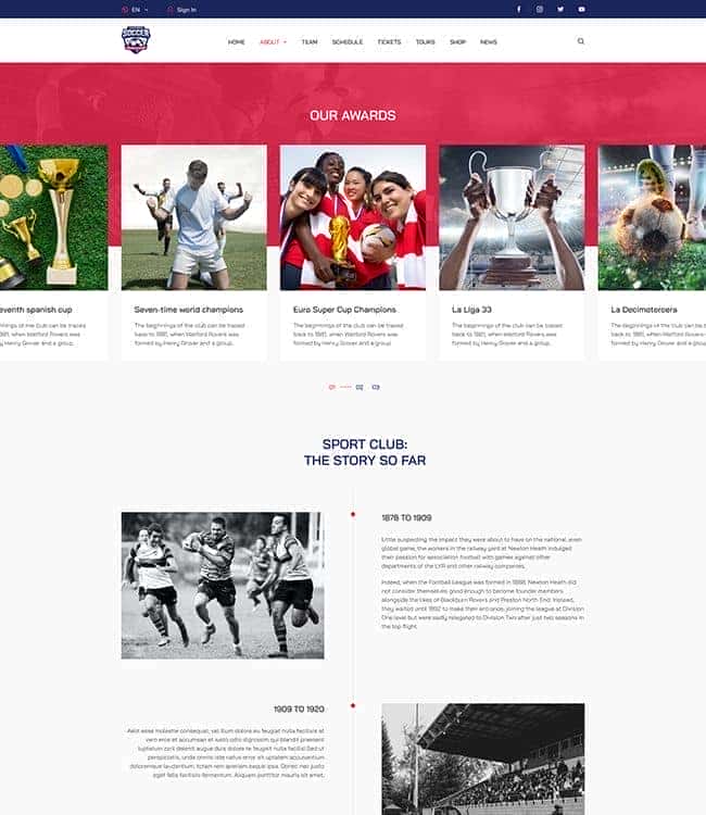 JA Sport is packed with beautiful layouts for About, Club award, mission, partners, and club tours to present corresponding content in smart and unique designs.