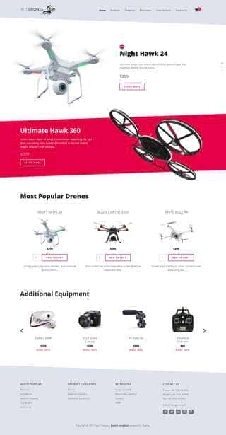 In the Hot Drones template demo, we (obviously) sell drones. Several main products are available in the main category. Each product can be accessed from the big responsive and touch friendly carousel. Beside that, there are one or more featured products. This category will be usually filled with products that are best sellers or currently on promotion. Another category of products are filled with equipment for drones. Regardless of the product you are selling, there are usually smaller, supporting products to the main products. Products from this category are also presented in the second, smaller instance of the carousel module.