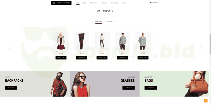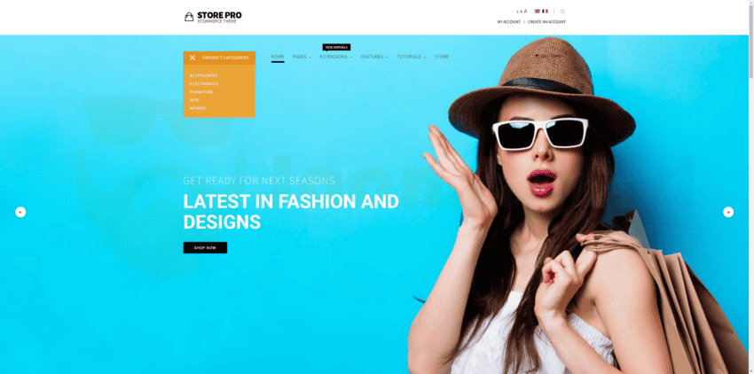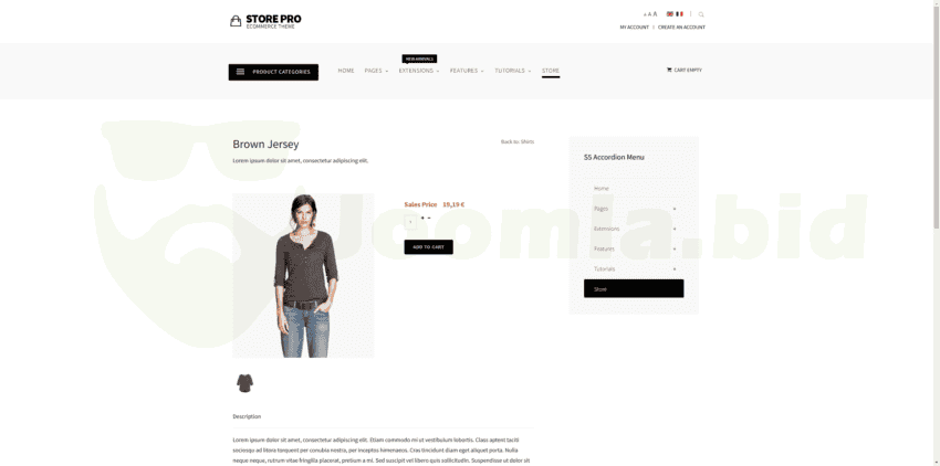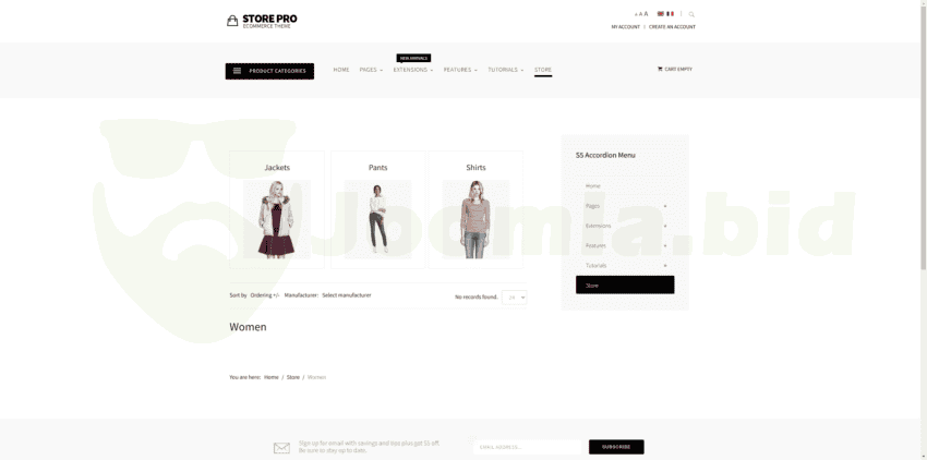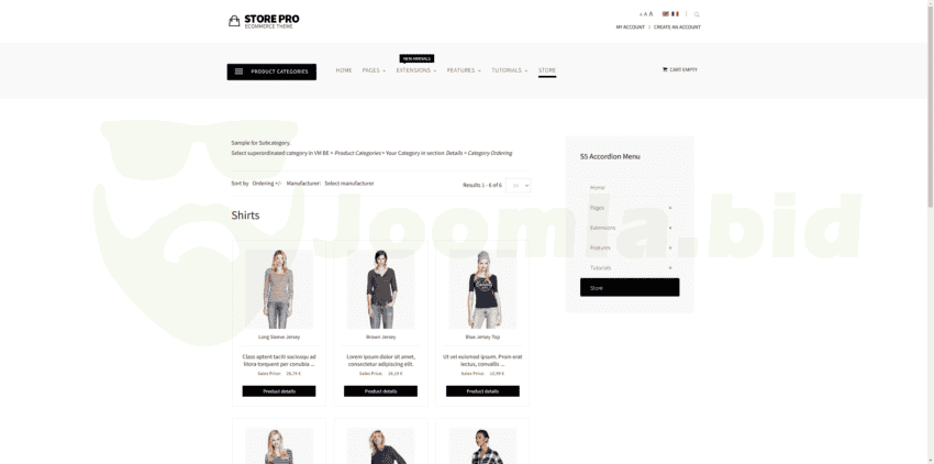 The Store Pro responsive Joomla ecommerce template makes a powerful solution for any ecommerce style website. The template is demo'd with the VirtueMart component and additional styling was added to match the design. We've added the "categories" button for easy acccess to any store menu you publish there. We've demo'd the template with VirtueMart but any menu can be published there including a default Joomla one. We've also included the countdown timer again perfect for any sales or promotions you may have to display.