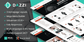 Vina Dazzi based on Helix 3 Framework (with Bootstrap 3 inside) and the latest version of Virtuemart – Virtuemart 3.0.16. It also provides lots of functional extensions and trendy features, such as: Mega Menu, Off-canvas Menu, Ajax VirtueMart Category Search, Virtuemart Product Compare, Product Quick View, Blog Quick View, VirtueMart Products Wishlist, VirtueMart One Page Checkout, Multi-Currencies, Multi-Languages, RTL Language Support, 7 powerful extensions from VinaGecko.com (save $70+) and many more features! Vina Dazzi included Quickstart package, so you can create new website with only some minutes even you don't need to know code knowledge!