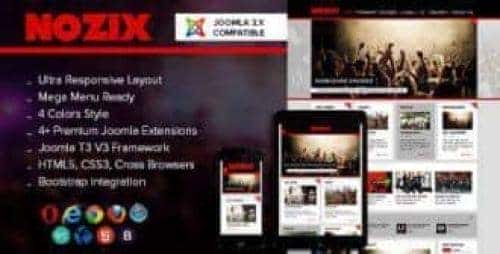 Nozix - Music Responsive Template - Joomla Nozix - Music Responsive Template - Joomla - 1 Live Preview → NOO Nozix - Joomla 3 Music Responsive Template Description Nozix is a high quality Joomla! template built in T3V3 Framework - the popular Template framework for for Joomla 3.0 using Bootstrap. Nozix is totally responsive, which means your website will have no trouble in loading on any screen size. Nozix comes with high technical quality and esthetic design. It has +4 powerful Joomla! extensions rolled in to give you a smoothly functioned and extremely easy-to-customize website. Plus, you are supported with the Clean-Clear-Simple layout with 4 color styles. The template is born for music business: bands, musicians, DJs, music blogger, music event, shows... Nozix is all you need to create a stunning & perfect music site.