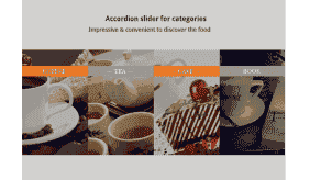 Your service item such as food, coffee in Capulus will be displayed in an accordion slider. All products display in a row, and only when you hover over it, the product detail will show up. Your products now look really smart showing and help customer have an overview in large amount of product in minutes.