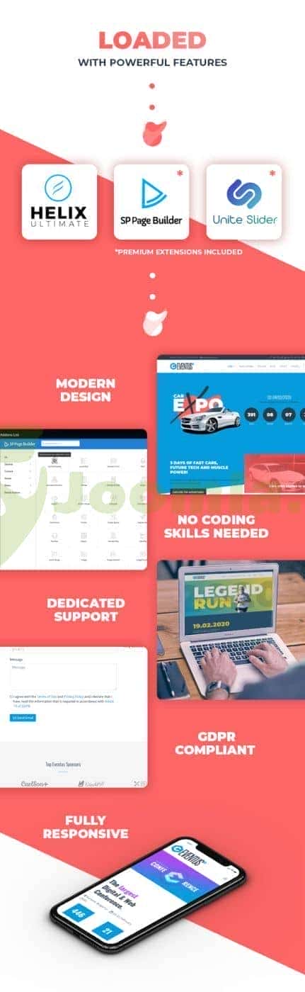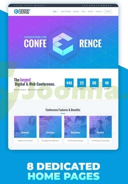 Eventus is a clean and modern event oriented Joomla! 3.X Template. Eventus comes with 8 dedicated home pages: conference, car expo, sport event, charity event, city quest event, church event, music event and wine & dine, food festival. The template is perfect also for any type of event or business site. Based on Helix Ultimate, the template gives many options for customizing with SP Page Builder and Unite Slider. With SP Page Builder you have more than 40+ addons ready.